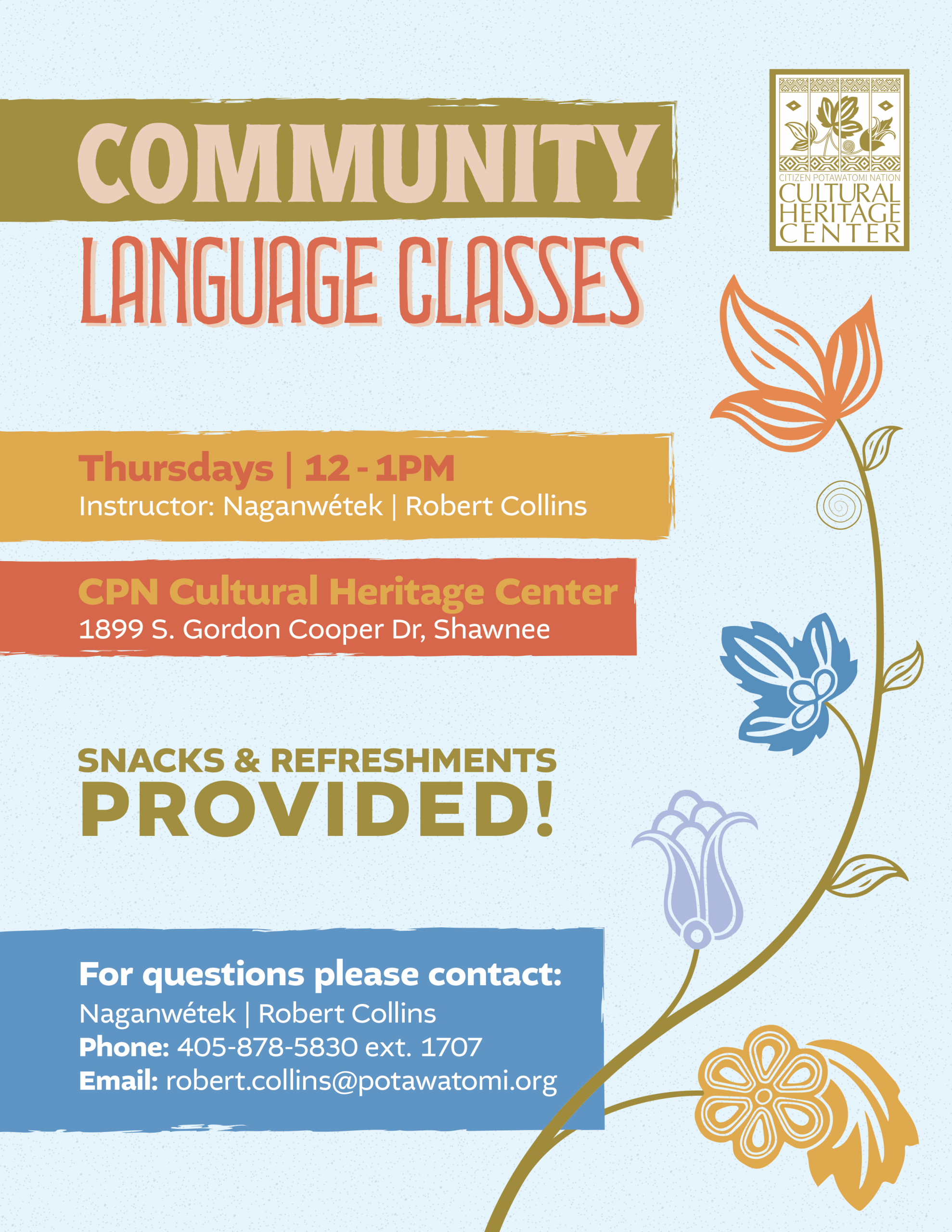 Every other Thursday, 12-1 p.m. at the Cultural Heritage Center. Instructor: Naganwétek | Robert Collins. For questions, contact r[email protected] or 405-878-5830 ext. 1707. Snacks and refreshments provided!